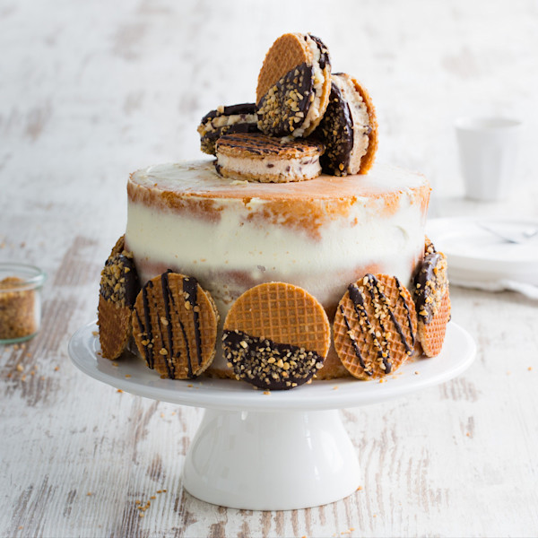 Niet voor niets de ultieme stroopwafeltaart. Deze biscuittaart is gevuld met stroopwafel-mascarponeroom en versierd met stroopwafels gehuld in een heerlijk chocolaagje met knapperige nougatine.